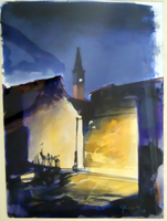 Un dipingere, quindi, che in questa occasione annovera un «corpus» di acquerelli eseguiti da Mario Chieppa, che ha delicatamente fissato un canale in Olanda e gli scogli a Ponza. E accanto a uno scorcio dell’Isola d’Elba, si nota la piacevole definizione della «Marionetta allegra», sospesa nello spazio, e della barca ancorata a riva, durante una mareggiata lungo la costa che trasforma l’ambiente.
