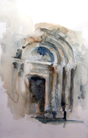 il portale della chiesa di San Costanzo è interpretato con fresca vena narrativa pur nella frammentarietà dell'immagine |