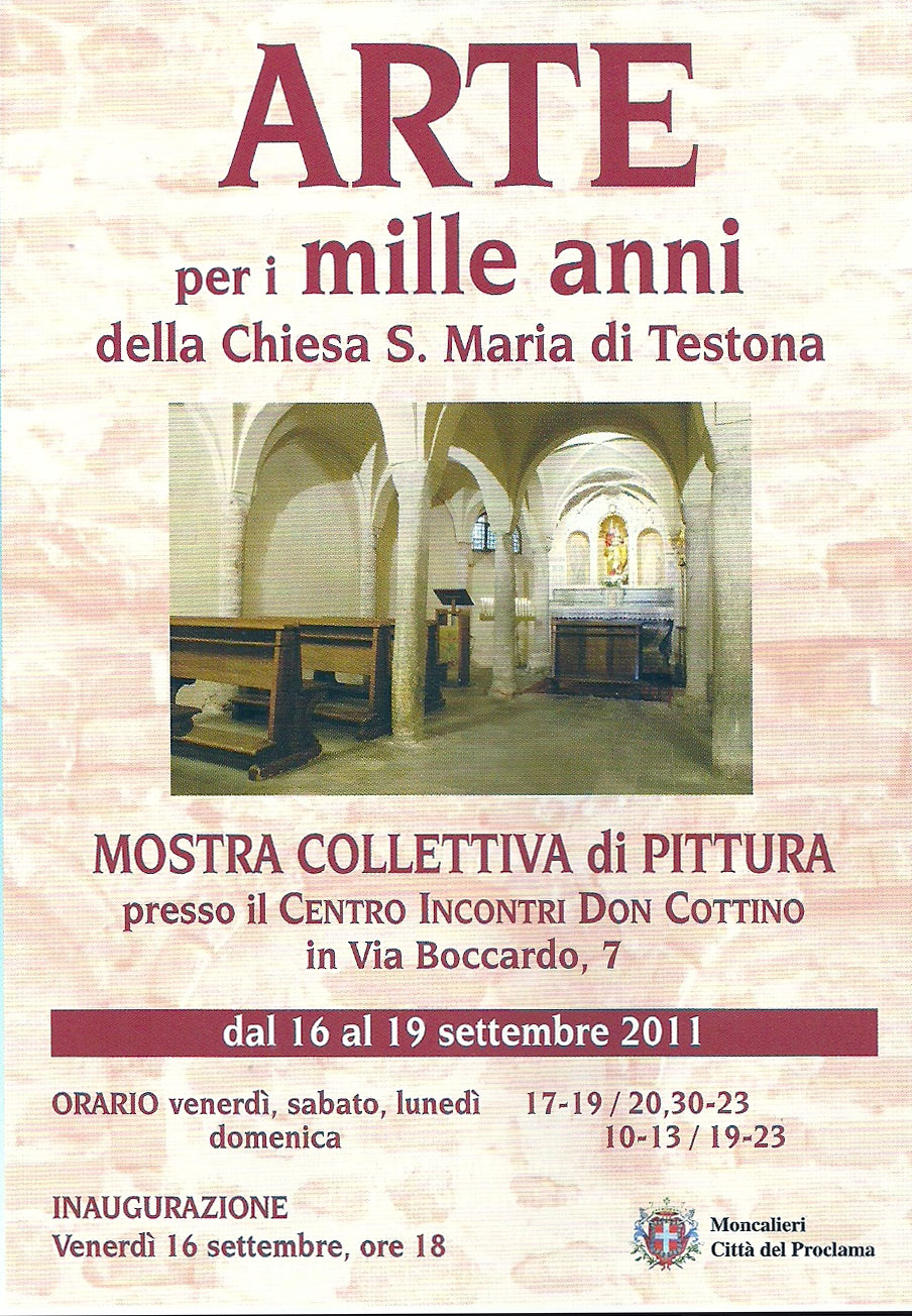 | TESTONA 2011 Nel Centro Incontri Don Cottino Un gruppo di pittori amici insieme per la Mostra Collettiva in occasione deli festeggiamenti per i mille anni della chiesa di S. Maria di Testona ![]() Dal 16 al 19 Settembre 2011 |